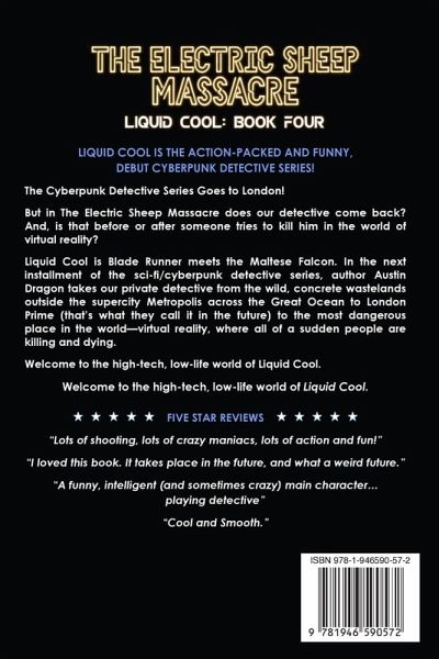 The Cyberpunk Detective Series Goes to London! But in The Electric Sheep Massacre does our detective come back? And, is that before or after someone tries to kill him in the world of virtual reality? Liquid Cool is the action-packed (and funny), debut cyberpunk detective series. Liquid Cool is Blade Runner meets the Maltese Falcon. In the next installment of the sci-fi/cyberpunk detective series, author Austin Dragon takes our private detective from the wild, concrete wastelands outside the supercity Metropolis across the Great Ocean to London Prime (that’s what they call it in the future) to the most dangerous place in the world—virtual reality, where all of a sudden people are killing and dying. It’s the cyberpunk novel reimagined—an ever-rainy world of colossal skyscrapers, hovercars, flashy neon streets, and futuristic mechanization. Metropolis isn’t a bad place, but it isn’t a good one either. Uber-governments and megacorporations fight for control of the fifty-million-plus supercity, but so does crime. Welcome to the high-tech, low-life world of Liquid Cool.