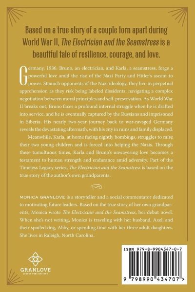 Monica Granlove is a storyteller and social commentator dedicated to motivating future leaders. Based on the true story of her own grandparents, Monica wrote The Electrician and the Seamstress, her debut novel. When she's not writing, Monica is traveling with her husband, Axel, and their spoiled dog, Abby, or spending time with her three adult daughters. She lives in Raleigh, North Carolina.