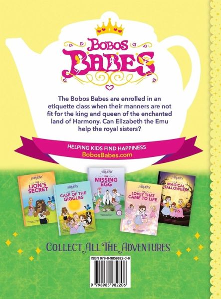 The magical sisters are enrolled in an etiquette class when their manners are not fit for the king and queen of the enchanted land of Harmony. Can Elizabeth the Emu help the royal sisters? In the beautiful and peaceful land of Harmony, three magical sisters, the Bobos Babes, uproot the kingdom's tranquility with some not-so-polite actions -nose-picking, belching, and other noisy...expulsions. Their parents, the King and Queen, enroll the sisters in the elegant Elizabeth the Emu's etiquette class where they learn manners and other ways to self-improve like being on time, politeness, and proper personal hygiene. Elizabeth the Emu explains to Angel Scarlet, Princess Daphne, and Fairy Cora that having proper etiquette is more than good manners, it's about being kind and courteous. And for the sisters? Well, let's just say that they will be needing more than one lesson from Elizabeth the Emu's etiquette class.