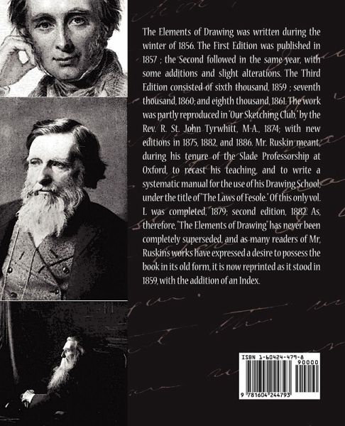 The Elements of Drawing was written during the winter of 1856. The First Edition was published in 1857 ; the Second followed in the same year, with some additions and slight alterations. The Third Edition consisted of sixth thousand, 1859 ; seventh thousand, 1860; and eighth thousand, 1861. The work was partly reproduced in "Our Sketching Club," by the Rev. R. St. John Tyrwhitt, M-A., 1874; with new editions in 1875, 1882, and 1886. Mr. Ruskin meant, during his tenure of the Slade Professorship at Oxford, to recast his teaching, and to write a systematic manual for the use of his Drawing School, under the title of "The Laws of Fesole." Of this only vol. L was completed, 1879; second edition, 1882. As, therefore, "The Elements of Drawing" has never been completely superseded, and as many readers of Mr, Ruskin's works have expressed a desire to possess the book in its old form, it is now reprinted as it stood in 1859, with the addition of an Index.