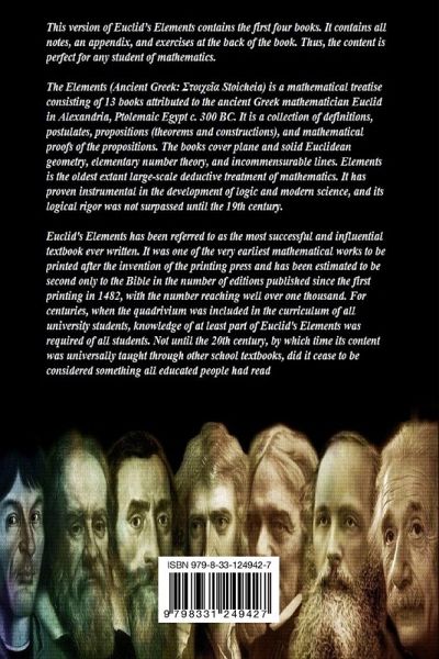 This version of Euclid's Elements contains the first four books. It contains all notes, an appendix, and exercises at the back of the book. Thus, the content is perfect for any student of mathematics. The Elements (Ancient Greek: Στοιχεῖα Stoicheia) is a mathematical treatise consisting of 13 books attributed to the ancient Greek mathematician Euclid in Alexandria, Ptolemaic Egypt c. 300 BC. It is a collection of definitions, postulates, propositions (theorems and constructions), and mathematical proofs of the propositions. The books cover plane and solid Euclidean geometry, elementary number theory, and incommensurable lines. Elements is the oldest extant large-scale deductive treatment of mathematics. It has proven instrumental in the development of logic and modern science, and its logical rigor was not surpassed until the 19th century. Euclid's Elements has been referred to as the most successful and influential textbook ever written. It was one of the very earliest mathematical works to be printed after the invention of the printing press and has been estimated to be second only to the Bible in the number of editions published since the first printing in 1482, with the number reaching well over one thousand. For centuries, when the quadrivium was included in the curriculum of all university students, knowledge of at least part of Euclid's Elements was required of all students. Not until the 20th century, by which time its content was universally taught through other school textbooks, did it cease to be considered something all educated people had read