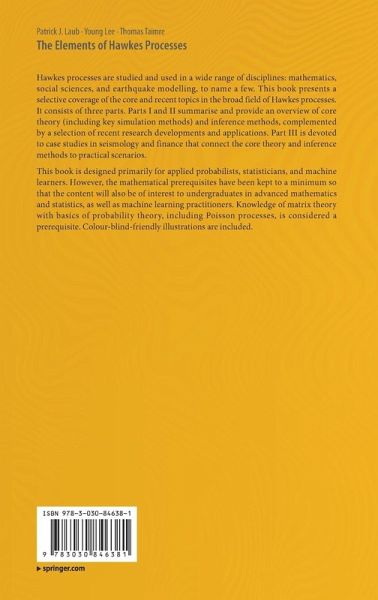 Hawkes processes are studied and used in a wide range of disciplines: mathematics, social sciences, and earthquake modelling, to name a few. This book presents a selective coverage of the core and recent topics in the broad field of Hawkes processes. It consists of three parts. Parts I and II summarise and provide an overview of core theory (including key simulation methods) and inference methods, complemented by a selection of recent research developments and applications. Part III is devoted to case studies in seismology and finance that connect the core theory and inference methods to practical scenarios.