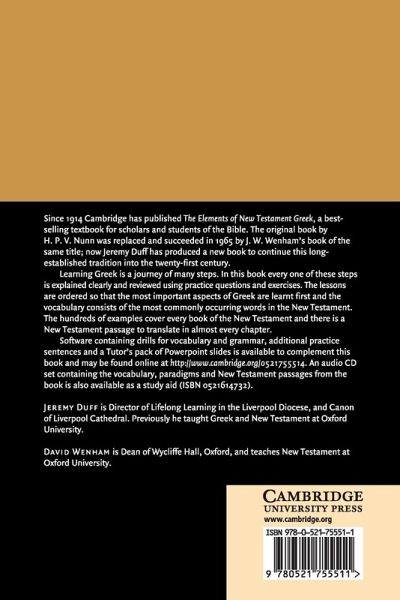 A step-by-step guide to learning New Testament Greek which assumes no prior knowledge of the language. Hundreds of examples cover every book of the New Testament and there is a passage to translate in almost every chapter. Jeremy Duff brings a century-old tradition of Cambridge learning to a new generation.
