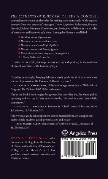 The Elements of Rhetoric offers a concise, comprehensive course in the rules for making your point stick. With copious examples from such masters of language as Cicero, Augustine, Shakespeare, Erasmus, Lincoln, Dickens, Newman, Chesterton, and Lewis, you will discover the 26 rules of persuasion and learn to apply them. Among the Elements you'll find: --The three modes of persuasion --How to structure an academic essay --How to spot and avoid logical fallacies --How to compose with literary figures --Practical tips for improving speed in composition --A Study Guide with exercises This is the essential guide to persuasive writing and speaking, in the tradition of Strunk and White's The Elements of Style. "Ryan Topping has produced a guide accessible and useful to those of all ages and experience levels, in the classroom, the political setting, and the pulpit."--Joseph R. Wood, Institute of World Politics "This is a splendid introduction to what you need to know to communicate wisely and well."--Quentin Schultze, Calvin College, author of An Essential Guide to Public Speaking "The Elements of Rhetoric is that rarest of rhetorical treats: a playfully serious and seriously playful summa of the art of communication--classical education at its very best!"--Raymond F. Hain, Providence College "Leading by example, Topping delivers a handy guide for all of us who rely on the art of persuasion. The Elements of Rhetoric is a gem."--Daniel B. Coupland, Hillsdale College, co-author of Well-Ordered Language: The Curious Child's Guide to Grammar "This is the book I have sought for 35 years. For those like me, for whom public speaking and writing is their stock-in-trade, this book is a must-have daily companion."--Michael C. Gilleran, Business & IP Trial Lawyer & Partner, Burns & Levinson, LLP, Boston, MA "This versatile guide can supplement course material from any discipline in order to help students polish presentations and essays."--ANN MARIE KLEIN, Department of Catholic Studies, University of St. Thomas, MN Ryan N.S. Topping earned a doctorate in Theology from The University of Oxford and is a Fellow of Thomas More College of the Liberal Arts. He has published several books on education and Christian culture.