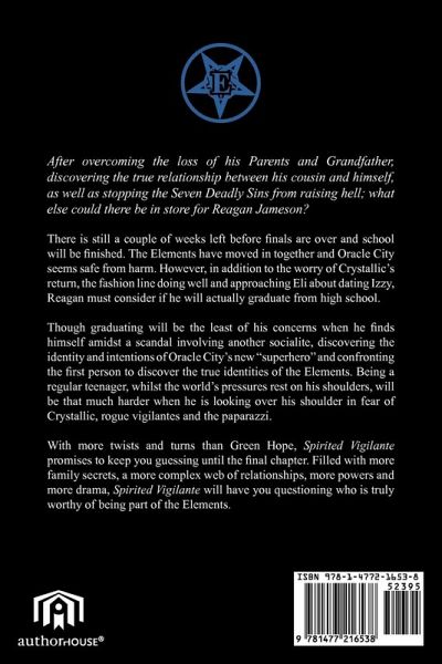 After overcoming the loss of his Parents and Grandfather, discovering the true relationship between his cousin and himself, as well as stopping the Seven Deadly Sins from raising hell; what else could there be in store for Reagan Jameson? There is still a couple of weeks left before finals are over and school will be finished. The Elements have moved in together and Oracle City seems safe from harm. However, in addition to the worry of Crystallic's return, the fashion line doing well and approaching Eli about dating Izzy, Reagan must consider if he will actually graduate from high school. Though graduating will be the least of his concerns when he finds himself amidst a scandal involving another socialite, discovering the identity and intentions of Oracle City's new "superhero" and confronting the first person to discover the true identities of the Elements. Being a regular teenager, whilst the world's pressures rest on his shoulders, will be that much harder when he is looking over his shoulder in fear of Crystallic, rogue vigilantes and the paparazzi. With more twists and turns than Green Hope, Spirited Vigilante promises to keep you guessing until the final chapter. Filled with more family secrets, a more complex web of relationships, more powers and more drama, Spirited Vigilante will have you questioning who is truly worthy of being part of the Elements.