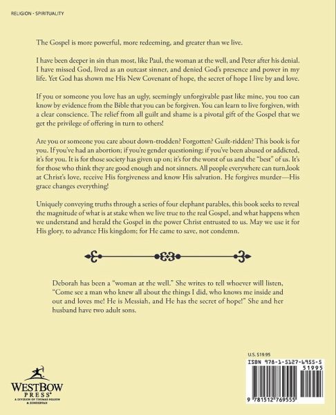 The Gospel is more powerful, more redeeming, and greater than we live. I have been deeper in sin than most, like Paul, the woman at the well, and Peter after his denial. I have missed God, lived as an outcast sinner, and denied God’s presence and power in my life. Yet God has shown me His New Covenant of hope, the secret of hope I live by and love. If you or someone you love has an ugly, seemingly unforgivable past like mine, you too can know by evidence from the Bible that you can be forgiven. You can learn to live forgiven, with a clear conscience. The relief from all guilt and shame is a pivotal gift of the Gospel that we get the privilege of offering in turn to others! Are you or someone you care about down-trodden? Forgotten? Guilt-ridden? This book is for you. If you’ve had an abortion; if you’re gender questioning; if you’ve been abused or addicted, it’s for you. It is for those society has given up on; it’s for the worst of us and the "best" of us. It’s for those who think they are good enough and not sinners. All people everywhere can turn,look at Christ’s love, receive His forgiveness and know His salvation. He forgives murder—His grace changes everything! Uniquely conveying truths through a series of four elephant parables, this book seeks to reveal the magnitude of what is at stake when we live true to the real Gospel, and what happens when we understand and herald the Gospel in the power Christ entrusted to us. May we use it for His glory, to advance His kingdom; for He came to save, not condemn.