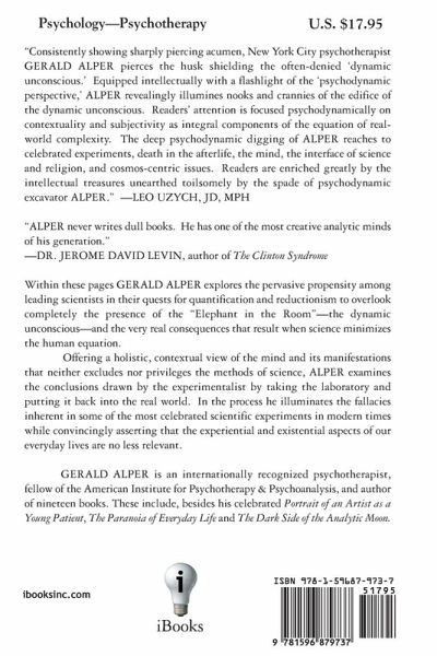 "Consistently showing sharply piercing acumen, New York City psychotherapist GERALD ALPER pierces the husk shielding the often-denied 'dynamic unconscious.' Equipped intellectually with a flashlight of the 'psychodynamic perspective,' ALPER revealingly illumines nooks and crannies of the edifice of the dynamic unconscious. Readers' attention is focused psychodynamically on contextuality and subjectivity as integral components of the equation of real-world complexity. The deep psychodynamic digging of ALPER reaches to celebrated experiments, death in the afterlife, the mind, the interface of science and religion, and cosmos-centric issues. Readers are enriched greatly by the intellectual treasures unearthed toilsomely by the spade of psychodynamic excavator ALPER." -LEO UZYCH, JD, MPH "ALPER never writes dull books. He has one of the most creative analytic minds of his generation." -DR. JEROME DAVID LEVIN, author of The Clinton Syndrome Within these pages GERALD ALPER explores the pervasive propensity among leading scientists in their quests for quantification and reductionism to overlook completely the presence of the "Elephant in the Room"-the dynamic unconscious-and the very real consequences that result when science minimizes the human equation. Offering a holistic, contextual view of the mind and its manifestations that neither excludes nor privileges the methods of science, ALPER examines the conclusions drawn by the experimentalist by taking the laboratory and putting it back into the real world. In the process he illuminates the fallacies inherent in some of the most celebrated scientific experiments in modern times while convincingly asserting that the experiential and existential aspects of our everyday lives are no less relevant. GERALD ALPER is an internationally recognized psychotherapist, fellow of the American Institute for Psychotherapy & Psychoanalysis, and author of nineteen books. These include, besides his celebrated Portrait of an Artist as a Young Patient, The Paranoia of Everyday Life and The Dark Side of the Analytic Moon.