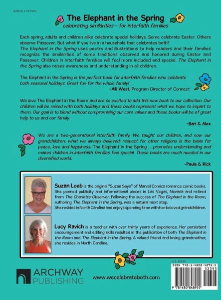 The Elephant in the Spring celebrating similarities - for interfaith families Each spring, adults and children alike celebrate special holidays. Some celebrate Easter. Others observe Passover. But what if you live in a household that celebrates both? The Elephant in the Spring uses poetry and illustrations to help readers and their families recognize the similarities of some traditions observed and honored during Easter and Passover. Children in interfaith families will feel more included and special. The Elephant in the Spring also raises awareness and understanding in all children. The Elephant in the Spring is the perfect book for interfaith families who celebrate both seasonal holidays. Great fun for the whole family! -Alli West, Program Director of Connect We love The Elephant in the Room and are so excited to add this new book to our collection. Our children will be raised with both holidays and these books represent what we hope to impart to them. Our goal is to blend without compromising our core values and these books will be of great help to us and our family. -Bari & Alex We are a two-generational interfaith family. We taught our children, and now our grandchildren, what we always believed: respect for other religions is the basis for peace, love and happiness. The Elephant in the Spring … promotes understanding and makes children in interfaith families feel special. These books are much needed in our diversified world. -Paula & Rick