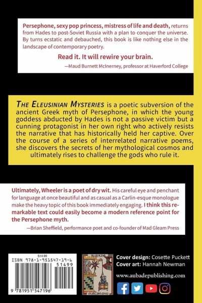The Eleusinian Mysteries is a poetic subversion of the ancient Greek myth of Persephone, in which the young goddess abducted by Hades is not a passive victim but a cunning protagonist in her own right who actively resists the narrative that has historically held her captive. Over the course of a series of interrelated narrative poems, she discovers the secrets of her mythological cosmos and ultimately rises to challenge the gods who rule it.