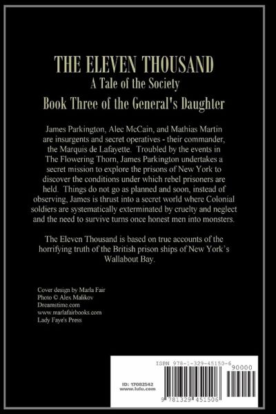 James Parkington, Alec McCain, and Mathias Martin are insurgents and secret operatives - their commander, the Marquis de Lafayette. Troubled by the events in The Flowering Thorn, James Parkington undertakes a secret mission to explore the prisons of New York to discover the conditions under which rebel prisoners are held. Things do not go as planned and soon, instead of observing, James is thrust into a secret world where Colonial soldiers are systematically exterminated by cruelty and neglect and the need to survive turns once honest men into monsters. The Eleven Thousand is based on true accounts of the horrifying truth of the British prison ships of New York's Wallabout Bay.