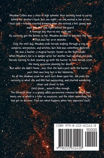 Meadow Collins was a shut-in high schooler that secretly loved to party behind her mother's back, but one night-as she waited in line at her local club-trouble started brewing when she noticed a hot, young man walk into the club right behind the guard. A teenage boy that no one could see. As curiosity got the better of her, Meadow decided to question the man. That was her first mistake. Only the next day, Meadow finds herself walking through a city of vampires, werewolves, and witches, but Ash was something different. He was a hunter, a magical hunter, known as the Nightshade. When Meadow's life is in danger after her mother had vanished, she finds herself turning to Ash, teaming up with the hunter to save herself from the many assassins planning her death. But what she didn't know... was that she had a past with the hunter, a past that was long lost in her memories. As all the shadows from her past cast down upon her, she finds the curiosity of what she and Ash had suffocating, and started wandering closer and closer to him. Until closer... wasn't close enough. The Eleventh Hour is a young adult paranormal romance between two teens, one of which is a killer of assassins, and the other something she had yet to discover. Find out what happens when two opposites clash.