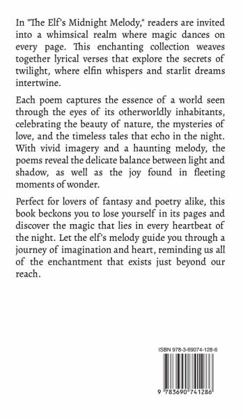 In "The Elf's Midnight Melody," readers are invited into a whimsical realm where magic dances on every page. This enchanting collection weaves together lyrical verses that explore the secrets of twilight, where elfin whispers and starlit dreams intertwine. Each poem captures the essence of a world seen through the eyes of its otherworldly inhabitants, celebrating the beauty of nature, the mysteries of love, and the timeless tales that echo in the night. With vivid imagery and a haunting melody, the poems reveal the delicate balance between light and shadow, as well as the joy found in fleeting moments of wonder. Perfect for lovers of fantasy and poetry alike, this book beckons you to lose yourself in its pages and discover the magic that lies in every heartbeat of the night. Let the elf's melody guide you through a journey of imagination and heart, reminding us all of the enchantment that exists just beyond our reach.