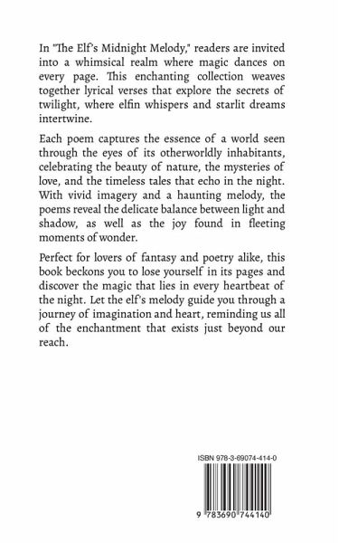 In "The Elf's Midnight Melody," readers are invited into a whimsical realm where magic dances on every page. This enchanting collection weaves together lyrical verses that explore the secrets of twilight, where elfin whispers and starlit dreams intertwine. Each poem captures the essence of a world seen through the eyes of its otherworldly inhabitants, celebrating the beauty of nature, the mysteries of love, and the timeless tales that echo in the night. With vivid imagery and a haunting melody, the poems reveal the delicate balance between light and shadow, as well as the joy found in fleeting moments of wonder. Perfect for lovers of fantasy and poetry alike, this book beckons you to lose yourself in its pages and discover the magic that lies in every heartbeat of the night. Let the elf's melody guide you through a journey of imagination and heart, reminding us all of the enchantment that exists just beyond our reach.