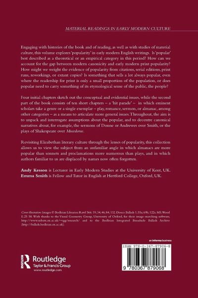 Engaging with histories of the book and of reading, as well as with studies of material culture, this volume explores 'popularity' in early modern English writings. Is 'popular' best described as a theoretical or an empirical category in this period? How can we account for the gap between modern canonicity and early modern print popularity? How might we weight the evidence of popularity from citations, serial editions, print runs, reworkings, or extant copies? Is something that sells a lot always popular, even where the readership for print is only a small proportion of the population, or does popular need to carry something of its etymological sense of the public, the people? Four initial chapters sketch out the conceptual and evidential issues, while the second part of the book consists of ten short chapters-a 'hit parade'- in which eminent scholars take a genre or a single exemplar - play, romance, sermon, or almanac, among other categories-as a means to articulate more general issues. Throughout, the aim is to unpack and interrogate assumptions about the popular, and to decentre canonical narratives about, for example, the sermons of Donne or Andrewes over Smith, or the plays of Shakespeare over Mucedorus. Revisiting Elizabethan literary culture through the lenses of popularity, this collection allows us to view the subject from an unfamiliar angle-in which almanacs are more popular than sonnets and proclamations more numerous than plays, and in which authors familiar to us are displaced by names now often forgotten.