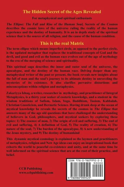 The Hidden Secret of the Ages Revealed For metaphysical and spiritual enthusiasts. The Ellipse: The Fall and Rise of the Human Soul, Secrets of the Cosmos describes the cosmic laws of the universe ruling the reality of the human experience and the destiny of humanity. It is an in depth study of the spiritual science that is the source of all religion, and the cause of the human condition. This is the real Matrix. The term ellipse which means imperfect circle, as opposed to the perfect circle, is the updated metaphor that replaces the traditional concepts of God and the devil, and good and evil as the human race evolves out of the age of mythology to the era of the merging of science and spirituality. This spiritual saga describes the inner and outer soul of the universe, the apocalypse, and the destiny of the human race. Delving deeper than any metaphysical writer of the past or present, the book reveals new insights about the fall of man and the soul's journey to its ultimate destiny in unraveling the mysteries of its existence. It also clarifies pervasive distortions and misconceptions within religion and metaphysics. Zakariyya Ishaq, a writer, researcher in mythology, and practitioner of Integral Metaphysics, is a thirty year seeker of esoteric knowledge, and a student in the wisdom traditions of Sufism, Islam, Yoga, Buddhism, Taoism, Kabbalah, Christian Gnosticism, and Hermetic Science. Having drunk deep at the ocean of mystical knowledge he reveals the secrets of the cosmos in The Ellipse that answers many of the age old questions that have challenged the understanding of believers in God, philosophers, and mystical seekers by exploring these topics: 1) The essence of man, 2) The origin of evil and suffering, 3) The end of evil and suffering, 4) A definition of God, 5) The reality of creation, 6) The nature of the soul, 7) The burden of the apocalypse, 8) A new understanding of the Jesus mystery, and 9) The destiny of humankind. This dynamic mystical cosmology is explained so the laymen and practitioners of metaphysics, religion and New Age ideas can enjoy an inspirational book that exhorts the world to peaceful co-existence and unity, and at the same time be well informed on the spiritual science that are at the root of their practice, and belief.