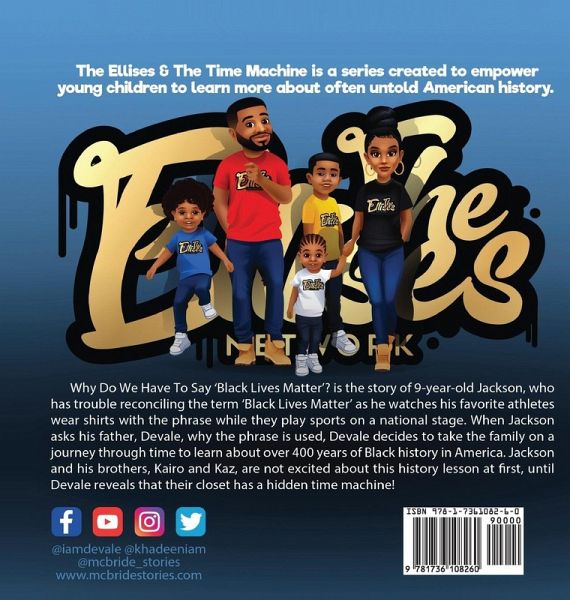The Ellises & The Time Machine is a series created to empower young children to learn more about often untold American history. Why Do We Have To Say 'Black Lives Matter'? is the story of 9-year-old Jackson, who has trouble reconciling the term 'Black Lives Matter' as he watches his favorite athletes wear shirts with the phrase while they play sports on a national stage. When Jackson asks his father, Devale, why the phrase is used, Devale decides to take the family on a journey through time to learn about over 400 years of Black history in America. Jackson and his brothers, Kairo and Kaz, are not excited about this history lesson at first, until Devale reveals that their closet has a hidden time machine!