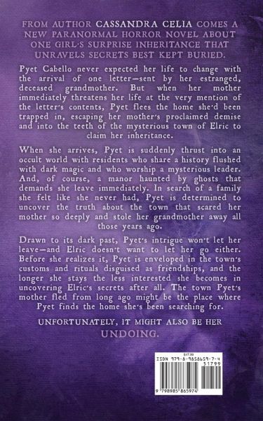 From author Cassandra Celia comes a new paranormal horror novel about one girl's surprise inheritance that unravels secrets best kept buried. Pyet Cabello never expected her life to change with the arrival of one letter-sent by her estranged, deceased grandmother. But when her mother immediately threatens her life at the very mention of the letter's contents, Pyet flees the home she'd been trapped in, escaping her mother's proclaimed demise and into the teeth of the mysterious town of Elric to claim her inheritance. When she arrives, Pyet is suddenly thrust into an occult world with residents who share a history flushed with dark magic and who worship a mysterious leader. And, of course, a manor haunted by ghosts that demands she leave immediately. In search of a family she felt like she never had, Pyet is determined to uncover the truth about the town that scared her mother so deeply and stole her grandmother away all those years ago. Drawn to its dark past, Pyet's intrigue won't let her leave-and Elric doesn't want to let her go either. Before she realizes it, Pyet is enveloped in the town's customs and rituals disguised as friendships, and the longer she stays the less interested she becomes in uncovering Elric's secrets after all. The town Pyet's mother fled from long ago might be the place where Pyet finds the home she's been searching for. Unfortunately, it might also be her undoing.
