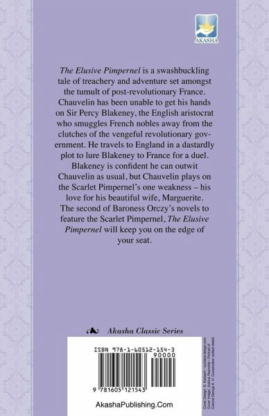 The Elusive Pimpernel is a swashbuckling tale of treachery and adventure set amongst the tumult of post-revolutionary France. Chauvelin has been unable to get his hands on Sir Percy Blakeney, the English aristocrat who smuggles French nobles away from the clutches of the vengeful revolutionary government. He travels to England in a dastardly plot to lure Blakeney to France for a duel. Blakeney is confident he can outwit Chauvelin as usual, but Chauvelin plays on the Scarlet Pimpernel's one weakness - his love for his beautiful wife, Marguerite. The second of Baroness Orczy's novels to feature the Scarlet Pimpernel, The Elusive Pimpernel will keep you on the edge of your seat.