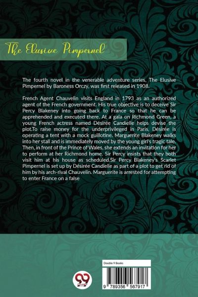 The fourth novel in the venerable adventure series, The Elusive Pimpernel by Baroness Orczy, was first released in 1908.French Agent Chauvelin visits England in 1793 as an authorized agent of the French government. His true objective is to deceive Sir Percy Blakeney into going back to France so that he can be apprehended and executed there. At a gala on Richmond Green, a young French actress named Désirée Candielle helps devise the plot.To raise money for the underprivileged in Paris, Désirée is operating a tent with a mock guillotine. Marguerite Blakeney walks into her stall and is immediately moved by the young girl's tragic tale. Then, in front of the Prince of Wales, she extends an invitation for her to perform at her Richmond home. Sir Percy insists that they both visit him at his house as scheduled.Sir Percy Blakeney's Scarlet Pimpernel is set up by Désirée Candielle as part of a plot to get rid of him by his arch-rival Chauvelin. Marguerite is arrested for attempting to enter France on a false passport, and the citizens of Boulogne are threatened with death if she escapes. But as always Percy is more than a match for his nemesis and proves his mettle in every battle.