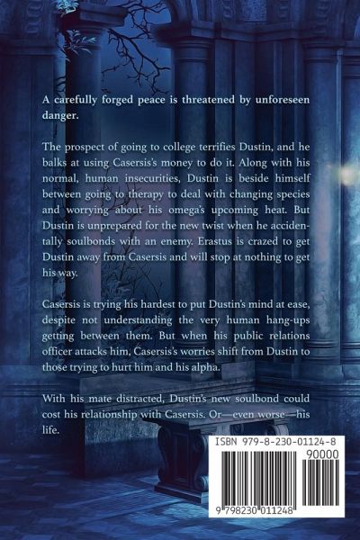 A carefully forged peace is threatened by unforeseen danger. The prospect of going to college terrifies Dustin, and he balks at using Casersis's money to do it. Along with his normal, human insecurities, Dustin is beside himself between going to therapy to deal with changing species and worrying about his omega's upcoming heat. But Dustin is unprepared for the new twist when he accidentally soulbonds with an enemy. Erastus is crazed to get Dustin away from Casersis and will stop at nothing to get his way. Casersis is trying his hardest to put Dustin's mind at ease, despite not understanding the very human hang-ups getting between them. But when his public relations officer attacks him, Casersis's worries shift from Dustin to those trying to hurt him and his alpha. With his mate distracted, Dustin's new soulbond could cost his relationship with Casersis. Or-even worse-his life. This 74,000-word non-shifter omegaverse novel is set in a world where mpreg (male pregnancy) is a fact of life. However, this series does not end with a baby or pregnancy. Fun Facts: Omegaverse, non-mpreg, non-shifter, younger alpha, older omega, still 3 million+ years of age gap, that will never change, Christmas shenanigans!, presents buying, secrets, danger, someone punches Casersis in the face, Casersis can't fight back, panic attacks brought on by oncoming heat cycle, "wait, heat?", knotting, sweet alpha, "you can get pregnant? What?", thank the universe Casersis is magically sterile because they aren't mature enough to have children yet, I said what I said, soulbonding, fated mates, mages, magic, always with our loveable idiots, well Casersis is still an idiot, Dustin much less so, but Cass is trying.