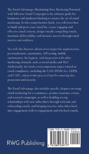 The Email Advantage: Maximizing Your Marketing Potential with Effective Email Campaigns is the ultimate guide for businesses and marketers looking to master the art of email marketing. In this comprehensive book, you will learn how to build and grow your email list, create engaging and effective email content, design visually compelling emails, maximize deliverability, and measure success through email metrics and analytics. You will also discover advanced strategies for segmentation, personalization, automation, A/B testing, mobile optimization, list hygiene, and integration with other marketing channels, such as social media and SEO. Additionally, the book covers important topics related to email compliance, including the CAN-SPAM Act, GDPR, and CASL, and provides practical tips for ensuring data protection and security. The Email Advantage also includes specific chapters on using email marketing for e-commerce, product launches, events, and seasonal campaigns, as well as building strong relationships with new subscribers through welcome and onboarding emails, and bringing inactive subscribers back into engagement with re-engagement and win-back emails. Finally, the book looks to the future of email marketing, with insights on emerging trends and predictions for the next decade. With real-world examples, case studies, and practical tips, The Email Advantage is an essential resource for any business or marketer looking to maximize their marketing potential through effective email campaigns.