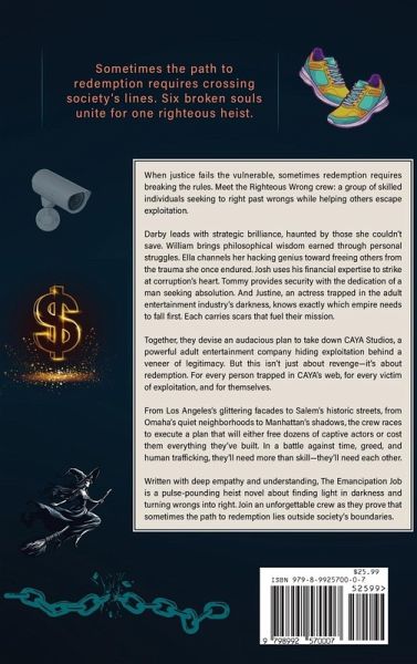 OCEAN'S 11 MEETS THE GIRL WITH THE DRAGON TATTOO When justice fails the vulnerable, sometimes redemption requires breaking the rules. Meet the Righteous Wrong crew: a band of skilled outcasts who've turned their painful pasts into purpose. Darby, a former athlete with strategic brilliance, leads this diverse team; William, a reformed gambler with philosophical wisdom; Ella, a brilliant hacker shaped by trauma; Josh, a banker using financial expertise to strike at corruption; Tommy, an ex-military operative seeking absolution; and Justine, an actress who escaped the adult entertainment industry only to plan its downfall. Their target? CAYA Studios-a powerful adult entertainment empire hiding exploitation behind glamour and executives who think they're untouchable. (Spoiler alert: they're not!) Their mission isn't just a heist-it's liberation. With precision planning, specialized skills, and a healthy dose of sardonic wit, they'll steal the studio's fortune, erase their operations, and free those trapped within its walls. From Los Angeles's glittering facades to Salem's historic streets, from Omaha's quiet neighborhoods to Manhattan's shadows, the crew navigates tense situations with deadpan humor and sharp banter while executing an audacious plan that will either free dozens of captive actors or cost them everything. In this pulse-pounding thriller about finding light in darkness, an unforgettable crew proves that sometimes redemption lies outside society's boundaries-and that even in the darkest circumstances, dry humor helps maintain sanity when the stakes couldn't be higher.