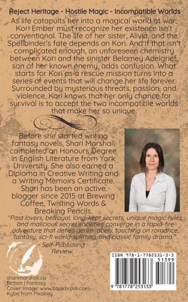 Reject Heritage ¿ Hostile Magic ¿ Incompatible Worlds As life catapults her into a magical world at war, Kori Ember must recognize her existence isn't conventional. The life of her sister, Alivia, and the fate of all Spellbinders depends on Kori. And if that isn't complicated enough, an unforeseen chemistry between Kori and the sinister Belamey Adelgrief, son of her known enemy, adds confusion. What starts out for Kori as a rescue mission, turns into a series of events that will change her life forever. Surrounded by mysterious threats, passion, and violence, Kori knows that her only chance for survival is to accept the two incompatible worlds that make her so unique.