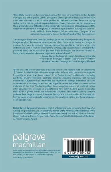 'Hereditary monarchies have always depended for their very survival on interdynastic marriages and fertile queens, yet the ambiguities of their power and status as women have often been obscured in their historical profiles. As the Renaissance emblem came to play such a central role in symbolic representations of royalty, however, we can now witness those ambiguities and difficulties in the emblematic representation of royal spouses of the early modern period that are explored in the revealing studies that make up this volume.' - Michael Bath, Senior Research Fellow, University of Glasgow, UK and author of Emblems for a Queen: The Needlework of Mary Queen of Scots