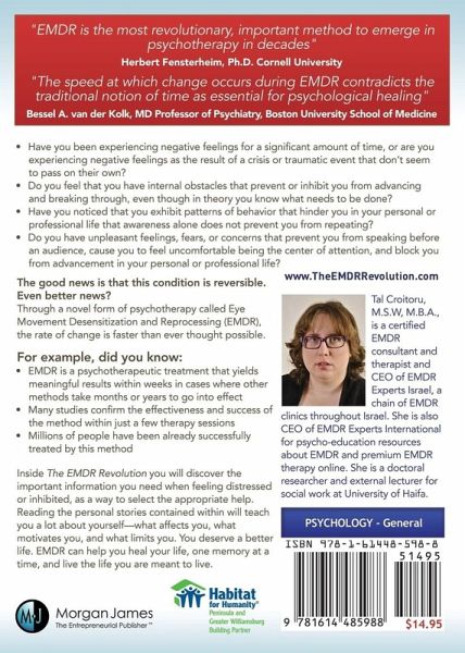 The EMDR Revolution educates readers about a revolutionary psychotherapy called EMDR, which stands for Eye Movement Desensitization and Reprocessing. The main parts of the book include a series of case studies and each case study includes lessons that readers can apply to themselves for better understanding of oneself and human nature. EMDR is the fastest and most efficient evidence-based therapy available today. It has resulted in 80-90 percent recovery from PTSD in five to twelve hours and was found to be much faster than cognitive behavior therapy. EMDR is the perfect solution for people who are tired of going through long years of therapy for distress or psychological barriers, those who are considering therapy but are daunted by the long-term commitment, those who have found out that awareness, willpower, and determination are not enough for change, and those who want a deep psychological change in an extremely short period of time. As psychiatrist and professor Bessel A. van der Kolk said, "The speed at which change occurs during EMDR contradicts the traditional notion of time as essential for psychological healing."
