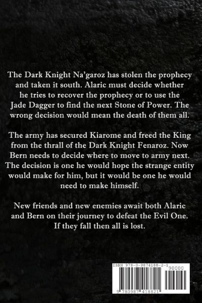 The Dark Knight Na'garoz has stolen the prophecy and taken it south. Alaric must decide whether he tries to recover the prophecy or to use the Jade Dagger to find the next Stone of Power. The wrong decision would mean the death of them all. The army has secured Kiarome and freed the King from the thrall of the Dark Knight Fenaroz. Now Bern needs to decide where to move to army next. The decision is one he would hope the strange entity would make for him, but it would be one he would need to make himself. New friends and new enemies await both Alaric and Bern on their journey to defeat the Evil One. If they fall then all is lost.