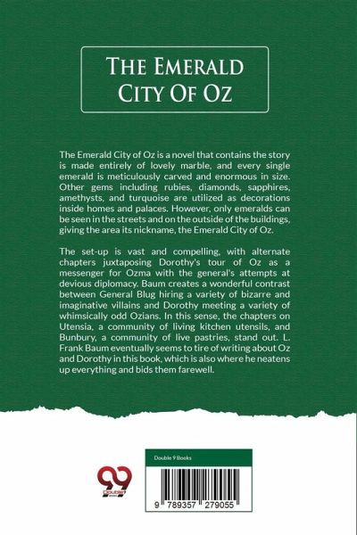 The Emerald City of Oz is a novel that contains the story is made entirely of lovely marble, and every single emerald is meticulously carved and enormous in size. Other gems including rubies, diamonds, sapphires, amethysts, and turquoise are utilized as decorations inside homes and palaces. However, only emeralds can be seen in the streets and on the outside of the buildings, giving the area its nickname, the Emerald City of Oz. The set-up is vast and compelling, with alternate chapters juxtaposing Dorothy's tour of Oz as a messenger for Ozma with the general's attempts at devious diplomacy. Baum creates a wonderful contrast between General Blug hiring a variety of bizarre and imaginative villains and Dorothy meeting a variety of whimsically odd Ozians. In this sense, the chapters on Utensia, a community of living kitchen utensils, and Bunbury, a community of live pastries, stand out. L. Frank Baum eventually seems to tire of writing about Oz and Dorothy in this book, which is also where he neatens up everything and bids them farewell.