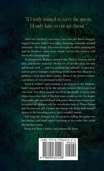 "If I truly wanted to serve the queen, I'd only have to cut my throat." After her mother's execution, ten-year-old Reina Sangrey begged Damien Arden-a wealthy, charming, criminally-minded aristocrat-for refuge. The terms to repay her debt, ensuring her and her brother's safety, were simple: survive the Armory, and rise to the Queensguard. At twenty-four, Reina is initiated into Thera's Armory, just as duty, and destiny required. On the eve of her first trial, her true gift reveals itself . . . and it is anything but ordinary. A once-in-a-century power emerges: something worth more than dragons or griffons-even more than a prince. Reina is the demon wielder,a prophecy of war promised to the Crown. Years as Arden's viper, training as an assassin in the shadows, hadn't prepared her to be the greatest weapon the Crown had ever seen. Nor did it exclude her from the deadly Armory trials where fewer than half of the first-years would survive. No longer disposable, and overwhelmed with power, Reina has to learn how to control her demons with the unwelcome help of Prince Farran and his own rare gift. Despite her strong will, Reina finds herself drawn to the brooding prince, but it couldn't matter. Surviving the Armory was her purpose, killing the queen was her destiny, and there wasn't anything in the realm that could change her course. Reina was born a traitor, and traitors die alone.