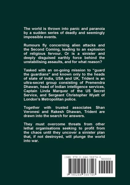 The world is thrown into panic and paranoia by a sudden series of deadly and seemingly impossible events. Rumours fly concerning alien attacks and the Second Coming, leading to an explosion of religious fervour. Or is a sinister and deeply disguised earthly force behind the unstabilising assaults, and for what reason? Tasked with an on-going mission to "guard the guardians" and known only to the heads of state of India, USA and UK, Trident is an ultra-secret group consisting of Premendra Dhawan, head of Indian intelligence services, Captain Linda Marquez of the US Secret Service, and Sergeant Christopher Wyatt of London's Metropolitan police. Together with trusted associates Shan Veronesi and Rakesh Dhawan, Trident are drawn into the search for answers. They must overcome threats from other lethal organisations seeking to profit from the chaos until they uncover a sinister plan that, if not destroyed, will plunge the world into war.