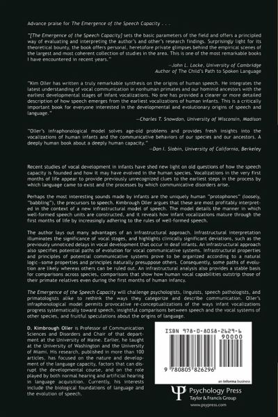 "The Emergence of the Speech Capacity" should challenge psychologists, linguists, speech pathologists and primatologists alike to rethink the ways they categorize and describe communication. Oller's infraphonological model permits provocative reconceptualizations of the ways infant vocalizations progress systematically toward speech, insightful comparisons between speech and the vocal systems of other species, and fruitful speculations about the origins of language.