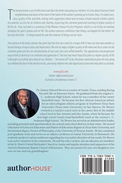 This book presents a set of reflections and ideas for better educating our children. It is also about Emerson Street -- neighborhood and name of the street of the home of the author's growing up in Austin, Texas. It is about race, class, quality of life, and faith, ending with suggestions about how to move schools toward a better system of academic success for all children and, thereby, impacting the common good and resulting in higher quality of life for all. Also, included is a summary of the Winners Always Practice Program, which is a set of tips on winning strategies for sports games and for life. The author expresses confidence that things can happen for the better; he has kept the faith - in things hoped for and the evidence of things not yet seen. The essence of the book conveys the point that the time has come for a major shift in how we treat one another as human beings of equal value and importance. We will all enjoy a higher quality of life when we focus more on the common good and less on considerations of race and class and selfish benefits. The appropriate and progressive way to look at diversity is to celebrate and appreciate it. The best and most impactful path to a higher quality of life is through successfully educating all our children -- "all means all!" So far, the plans commonly in place for educating our children fall short in the desired results, and many children miss the opportunity to become educated successfully. www.jcbil.com Twitter: @jbrowneducator facebook.com/johnny.e.brown.7