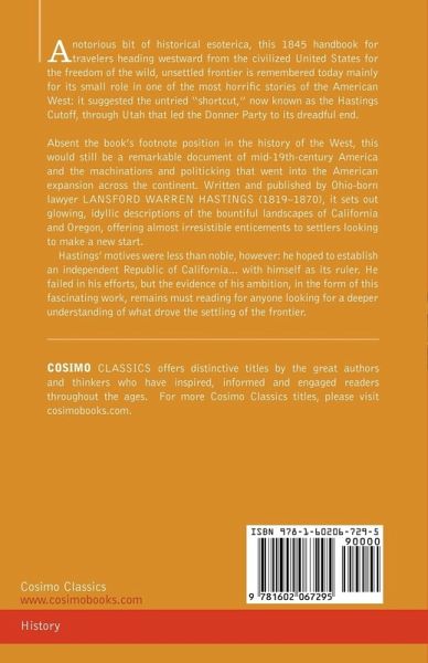 A notorious bit of historical esoterica, this 1845 handbook for travelers heading westward from the civilized United States for the freedom of the wild, unsettled frontier is remembered today mainly for its small role in one of the most horrific stories of the American West: it suggested the untried "shortcut," now known as the Hastings Cutoff, through Utah that led the Donner Party to its dreadful end. Absent the book's footnote position in the history of the West, this would still be a remarkable document of mid-19th-century America and the machinations and politicking that went into the American expansion across the continent. Written and published by Ohio-born lawyer LANSFORD WARREN HASTINGS (1819-1870), it sets out glowing, idyllic descriptions of the bountiful landscapes of California and Oregon, offering almost irresistible enticements to settlers looking to make a new start. Hastings' motives were less than noble, however: he hoped to establish an independent Republic of California... with himself as its ruler. He failed in his efforts, but the evidence of his ambition, in the form of this fascinating work, remains must reading for anyone looking for a deeper understanding of what drove the settling of the frontier.