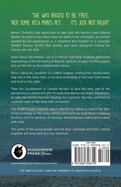 "She was raised to be free, not some rich man's pet . . . It's just not right!" Bernie Cholach's dad wants him to take over the family's rural Alberta feedlot, but Bernie has other ideas: he wants to be a biologist, an interest sparked by his experiences as a volunteer bird handler at a Canadian Wildlife Service facility that breeds and rears peregrine falcons for release into the wild. Sheik Nasur bin Mukhta, son of a Persian Gulf emir, studying petroleum engineering at the University of Alberta, dutifully accepts his life's course, laid out for him by his traditionalist culture. Rosie Leboucan, daughter of a Métis trapper, running her injured dad's trap line in the Swan Hills, is focused on keeping a roof over their heads and food on the table. Then the Government of Canada decides to give the emir one of the peregrines as a diplomatic gift. It's more than Bernie can stand. Impulsively, he takes the bird he has been tending-he's named it Skyrider-and flees to a remote cabin in the Swan Hills wilderness. The RCMP mount a search. Nasur, sent by his father to collect the bird, insists on being on the scene-which turns out to be both Rosie's trapping territory and the territory of a hungry and dangerous mama grizzly bear with cubs. The paths of the young people and the bear converge-and their coming together will send each in a new direction.