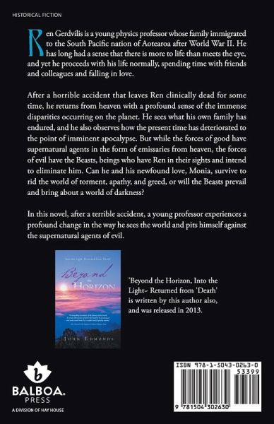 Ren Gerdvilis is a young physics professor whose family immigrated to the South Pacific nation of Aotearoa after World War II. He has long had a sense that there is more to life than meets the eye, and yet he proceeds with his life normally, spending time with friends and colleagues and falling in love. After a horrible accident that leaves Ren clinically dead for some time, he returns from heaven with a profound sense of the immense disparities occurring on the planet. He sees what his own family has endured, and he also observes how the present time has deteriorated to the point of imminent apocalypse. But while the forces of good have supernatural agents in the form of emissaries from heaven, the forces of evil have the Beasts, beings who have Ren in their sights and intend to eliminate him. Can he and his newfound love, Monia, survive to rid the world of torment, apathy, and greed, or will the Beasts prevail and bring about a world of darkness? In this novel, after a terrible accident, a young professor experiences a profound change in the way he sees the world and pits himself against the supernatural agents of evil.