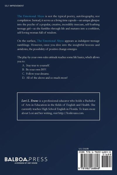 The Emotional Abyss is not the typical poetry, autobiography, nor compilation. Instead, it serves as a living time capsule-an unique glimpse into the psyche of a popular, creative, incredibly insecure, self-loathing teenage girl-as she fumbles through life and matures into a confident, self-loving woman full of wisdom. On the surface, The Emotional Abyss appears as indulgent teenage ramblings. However, once you dive into the insightful lessons and antidotes, the possibility of positive change emerges. The play-by-your-own-rules attitude teaches some life basics, which allows you to: A. Stay true to yourself. B. Be your own BFF. C. Follow your dreams. D. All of the above and so much more!