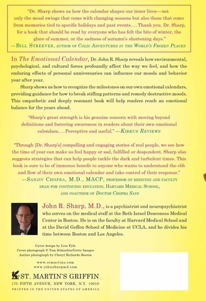 A leading Harvard psychiatrist reveals how our emotional lives are profoundly shaped by the seasons, and how to recognize our own seasonal patterns and milestones In The Emotional Calendar, Sharp reveals how environmental, psychological, and cultural forces profoundly affect the way we feel, and how the enduring effects of personal anniversaries can influence our moods and behavior year after year. Sharp also illustrates a wide range of individual responses to cultural phenomena: some people feel anxious at the start of a new school year or are undone by the prospect of tax season while others are buoyed by the start of a sports season. Sharp shows us how to recognize the milestones on our own emotional calendars, providing guidance for how to break stifling patterns and remedy destructive moods. This empathetic and deeply resonant book will help readers reach an emotional balance for the years ahead.