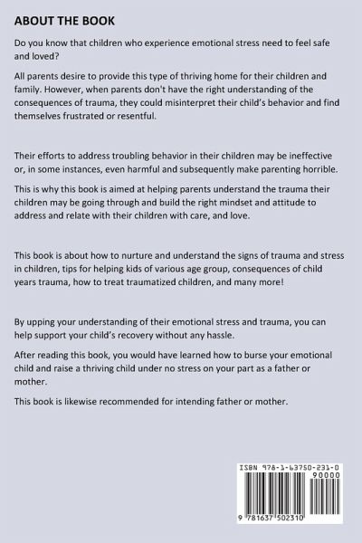 Do you know that children who experience emotional stress need to feel safe and loved? All parents desire to provide this type of thriving home for their children and family. However, when parents don't have the right understanding of the consequences of trauma, they could misinterpret their child's behavior and find themselves frustrated or resentful. Their efforts to address troubling behavior in their children may be ineffective or, in some instances, even harmful and subsequently make parenting horrible. This is why this book is aimed at helping parents understand the trauma their children may be going through and build the right mindset and attitude to address and relate with their children with care, and love. This book is about how to nurture and understand the signs of trauma and stress in children, tips for helping kids of various age group, consequences of child years trauma, how to treat traumatized children, and many more! By upping your understanding of their emotional stress and trauma, you can help support your child's recovery without any hassle. After reading this book, you would have learned how to burse your emotional child and raise a thriving child under no stress on your part as a father or mother. This book is likewise recommended for intending fathers and/or mothers.