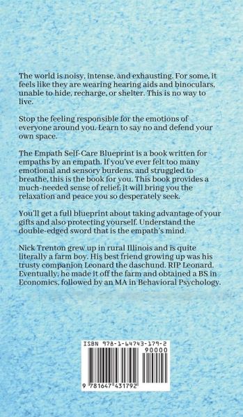 Defend and claim your space, say no to people, and compensate for your unique sensitivities. The world is noisy, intense, and exhausting. For some, it feels like they are wearing hearing aids and binoculars, unable to hide, recharge, or shelter. This is no way to live. Stop the feeling responsible for the emotions of everyone around you. Learn to say no and defend your own space. The Empath Self-Care Blueprint is a book written for empaths by an empath. If you've ever felt too many emotional and sensory burdens, and struggled to breathe, this is the book for you. This book provides a much-needed sense of relief; it will bring you the relaxation and peace you so desperately seek. You'll first learn what makes you different, how you perceive the world differenly, and most importantly, how to live better and more happily. You'll get a full blueprint about taking advantage of your gifts and also protecting yourself. Understand the double-edged sword that is the empath's mind. Tools for protecting yourself from sensory overload and exhaustion, and managing compassion fatigue. Nick Trenton grew up in rural Illinois and is quite literally a farm boy. His best friend growing up was his trusty companion Leonard the dachshund. RIP Leonard. Eventually, he made it off the farm and obtained a BS in Economics, followed by an MA in Behavioral Psychology. Practice self-care, self-protection, and learn to declare your boundaries and limits. ¿Answer the question, "Why do I feel so intensely?" ¿Differentiate between normal empathy, narcissists, introverts, highly sensitive people, and more. ¿Learn to manage your energy as well as the people around you. ¿Best practices for work, socializing, and even romance. Make constant, everyday overwhelm a thing of the past. Stop feeling the weight of the world on your shoulders. Face the world knowing that you are beautifully unique and that you can handle pressure without feeling the burden of too many emotions.