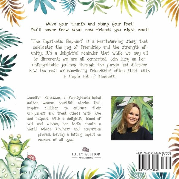 In "The Empathetic Elephant," acclaimed children's author Jennifer Randazzo presents a heartwarming tale of Lucy, a kind-hearted elephant on a quest for friendship in the jungle's heart. Lucy's journey is not without challenges; she faces initial rejections from other jungle animals. However, her unyielding spirit and deep empathy guide her to understand and cater to each animal's unique needs. This enchanting story unfolds as Lucy extends thoughtful gestures - from offering a sleep mask to an owl to sharing bananas with a busy monkey. Her acts of kindness gradually win over the hearts of the jungle inhabitants. "The Empathetic Elephant" is a celebration of the power of empathy, the significance of understanding others, and the beauty of diversity. Jennifer Randazzo's captivating narrative teaches children valuable lessons about the joy of friendship and the strength of unity. It's a delightful reminder that our differences unite us, and through empathy and friendship, we can discover the magic that binds us all. Join Lucy on her unforgettable journey in "The Empathetic Elephant" and embrace the transformative power of empathy and connection.