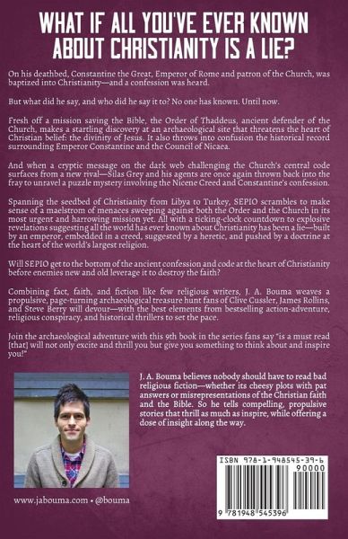 What if All You've Ever Known about Christianity Is a Lie? On his deathbed, Constantine the Great, Emperor of Rome and patron of the Church, was baptized into Christianity-and a confession was heard. But what did he say, and who did he say it to? No one has known. Until now. Fresh off a mission saving the Bible, the Order of Thaddeus, ancient defender of the Church, makes a startling discovery at an archaeological site that threatens the heart of Christian belief: the divinity of Jesus. It also throws into confusion the historical record surrounding Emperor Constantine and the Council of Nicaea. And when a cryptic message on the dark web challenging the Church's central code surfaces from a new rival-Silas Grey and his agents are once again thrown back into the fray to unravel a puzzle mystery involving the Nicene Creed and Constantine's confession. Spanning the seedbed of Christianity from Libya to Turkey, SEPIO scrambles to make sense of a maelstrom of menaces sweeping against both the Order and the Church in its most urgent and harrowing mission yet. All with a ticking-clock countdown to explosive revelations suggesting all the world has ever known about Christianity has been a lie-built by an emperor, embedded in a creed, suggested by a heretic, and pushed by a doctrine at the heart of the world's largest religion. Will SEPIO get to the bottom of the ancient confession and code at the heart of Christianity before enemies new and old leverage it to destroy the faith? Combining fact, faith, and fiction like few religious writers, J. A. Bouma weaves a propulsive, page-turning archaeological treasure hunt fans of Clive Cussler, James Rollins, and Steve Berry will devour-with the best elements from bestselling action-adventure, religious conspiracy, and historical thrillers to set the pace. Join the archaeological adventure with this 9th book in the series fans say "is a must read [that] will not only excite and thrill you but give you something to think about and inspire you!"