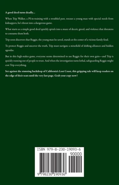 A good deed turns deadly... When Trip Walker, a PI-in-training with a troubled past, rescues a young man with special needs from kidnappers, he's thrust into a dangerous game. What starts as a simple good deed quickly spirals into a maze of deceit, greed, and violence that threatens to consume them both. Trip soon discovers that Reggie, the young man he saved, stands at the center of a vicious family feud. To protect Reggie and uncover the truth, Trip must navigate a minefield of shifting alliances and hidden agendas. But in this high-stakes game, everyone seems determined to use Reggie for their own gain-and Trip is quickly running out of people to trust. And when the investigation turns lethal, safeguarding Reggie might cost Trip everything. Set against the stunning backdrop of California's Lost Coast, this gripping tale will keep readers on the edge of their seats until the very last page. Grab your copy now!