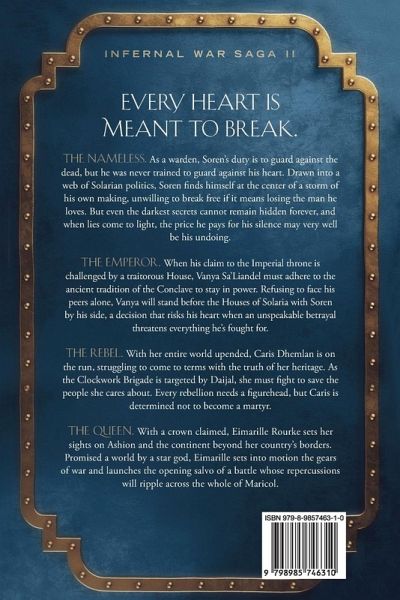 Every heart is meant to break. THE NAMELESS. As a warden, Soren's duty is to guard against the dead, but he was never trained to guard against his heart. Drawn into a web of Solarian politics, Soren finds himself at the center of a storm of his own making, unwilling to break free if it means losing the man he loves. But even the darkest secrets cannot remain hidden forever, and when lies come to light, the price he pays for his silence may very well be his undoing. THE EMPEROR. When his claim to the Imperial throne is challenged by a traitorous House, Vanya Sa'Liandel must adhere to the ancient tradition of the Conclave to stay in power. Refusing to face his peers alone, Vanya will stand before the Houses of Solaria with Soren by his side, a decision that risks his heart when an unspeakable betrayal threatens everything he's fought for. THE REBEL. With her entire world upended, Caris Dhemlan is on the run, struggling to come to terms with the truth of her heritage. As the Clockwork Brigade is targeted by Daijal, she must fight to save the people she cares about. Every rebellion needs a figurehead, but Caris is determined not to become a martyr. THE QUEEN. With a crown claimed, Eimarille Rourke sets her sights on Ashion and the continent beyond her country's borders. Promised a world by a star god, Eimarille sets into motion the gears of war and launches the opening salvo of a battle whose repercussions will ripple across the whole of Maricol.