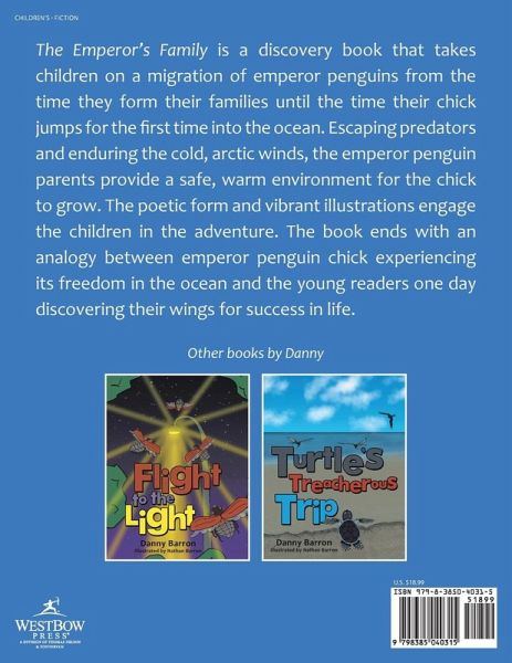 The Emperor's Family is a discovery book that takes children on a migration of emperor penguins from the time they form their families until the time their chick jumps for the first time into the ocean. Escaping predators and enduring the cold, arctic winds, the emperor penguin parents provide a safe, warm environment for the chick to grow. The poetic form and vibrant illustrations engage the children in the adventure. The book ends with an analogy between emperor penguin chick experiencing its freedom in the ocean and the young readers one day discovering their wings for success in life.