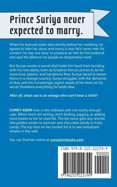 He married a man he had never met. The worst thing he could do was fall in love. Prince Suriya never thought he would marry. When his beloved sister dies not long before her wedding, he agrees to take her place and marry an emperor. As the new consort, he has one duty: to produce an heir and secure the alliance his people so desperately need. Suriya soon finds himself falling in love with Emperor Kenosi, who proves to be far more kind, patient, and handsome than Suriya dared to dream. But Suriya has a secret that could jeopardize his nation's safety--and shatter the marriage he's come to cherish. Alone in a strange country, Suriya struggles with the demands of duty and the increasingly urgent needs of his heart. As pressure mounts to produce an heir, Suriya is forced at last to confront the consequences of his deception.