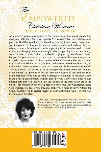 As a believer, you are an empowered Christian woman. You attend church. You read your Bible daily. You pray regularly. Yet, you don't feel the confidence and power of God that you think you should in your day-to-day living. Sometimes, you find yourself feeling fearful, insecure, anxious or defeated; and especially so, when you watch the news and what is happening in this unstable world, chaotic nation, and changing culture-and maybe what's happening in your own family. As a Christian, you don't think you should be plagued by soulish weaknesses, but you feel powerless to overcome them. If this sounds like you, then you are in good company as one of a large number of faithful women who feel the same way. You love God with all of your heart and are determined to follow Him, no matter what. However, you find yourself wondering, "Is there something more?" This book holds your answer in its unveiling of Bible truth about the "Promise of the Father" or "promise of power" and the evidence of that truth revealed in the thrilling stories and exciting examples of workings of the Holy Spirit in the lives of contemporary women, just like you. It lays out a practical and biblical path that will take you into the fullness of the empowered life in the Spirit. This promise of power will help you overcome your weaknesses, build your confidence to face every situation, make you a more effective witness for Christ, and take you to greater heights in your relationship with God than you ever dreamed possible. Anita Lantz is a public speaker and author of The Empowered Christian Woman: The Promise of New Life-the first in her book series. Her 30-plus years in public ministry provided the foundational resource for writing this series
