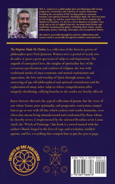 The Empress Needs No Clothes is a collection of the favorite poems of philosopher-poet Nick Jameson. Written over a period of nearly two decades, it spans a great spectrum of subjects and inspirations. The anguish of unrequited love, the insights of spirituality free of the erroneous specifications and confines of religion, the war with traditional modes of mass economic exploitation and mental oppression, the love and worship of Spirit through nature, the answering of age-old philosophical and spiritual conundrums and the exploration of subjects whose comprehension offer uniquely elucidating, edifying benefits to the reader are hereby offered. Buyer beware: this isn't the typical collection of poems, but the verse of one whose honor, pure spirituality and progressive convictions compel him to go to war with all that which enslaves and erodes humanity, even when that means being misunderstood and condemned by those whom he thereby serves. Complemented by the talented Brazilian artist Lanna Ariel, the "Witch of Paintings," this book is a sword stained with the author's blood, forged in the fires of rage and revelation, wielded against, and for, everything that compels him to put the pen to the page.
